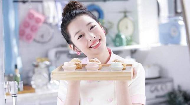 Sulli terlihat sedang memegang sendok dan garpu. Di